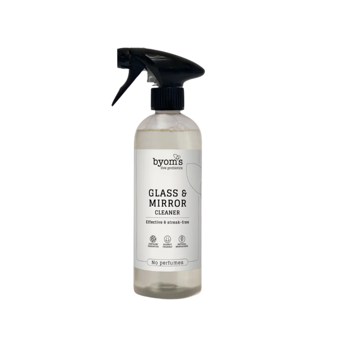 Byoms Glass & Mirror Cleaner säkerställer skinande rena glasytor utan ränder. Den probiotiska formulan avlägsnar effektivt fett, smuts och fingeravtryck samtidigt som den bidrar till en mer balanserad mikroflora i ditt hem. Perfekt för fönster, speglar, glasbord och andra blanka ytor.