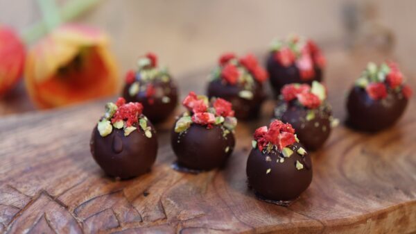 Små lyxiga rawbollar gjorda på mixade cashewnötter, dadlar och torkade tranbär. Rullas till bollar och doppas i 100 % choklad sötad med honung, toppade med pistagenötter och frystorkade jordgubbar för extra crunch och smak.